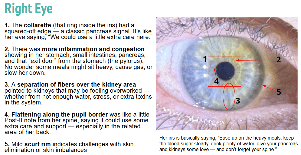 A client with a squared-off collarette (pancreas cue), digestive congestion, and pupil-border flattening (spine stress) experienced crashes and back fatigue after meals. Once we added bile support, hydration, steady carbs, and spine care, her energy and metabolism shifted noticeably.